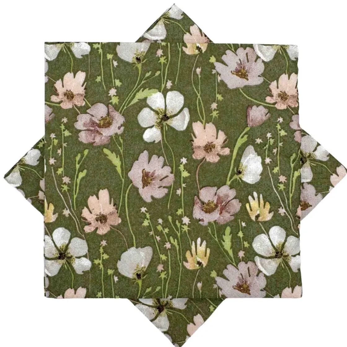 Serviettene med et sjarmerende blomsterdesign på en dyp grønn bakgrunn lyser opp bordet på et øyeblikk. De er perfekte for å sette stemningen til både avslappende middager og festlige sammenkomster.