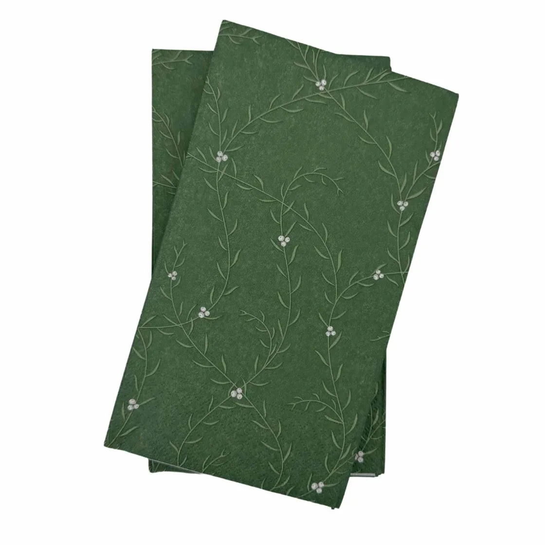 Serviettene på bildet har et grønt design med fine, enkle grener og små hvite bær. De er perfekte for å dekke bordet til både hverdagslige og festlige anledninger.