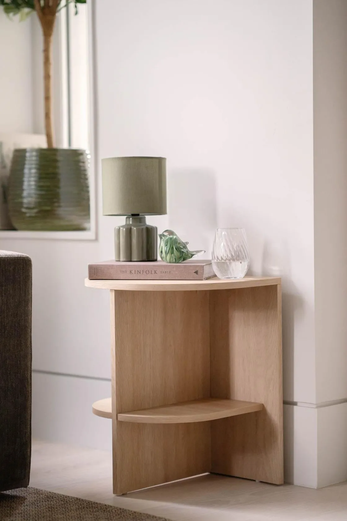 Et sidebord som utnytter plassen effektivt. Hyllen gir et praktisk sted for bøker, planter eller små ting som trenger et sted å bo. Laget med en lys eik look som gir en naturlig finish som lett passer inn i stuen, soverommet eller gangen. Skaper en lun følelse og hjelper med å holde orden.