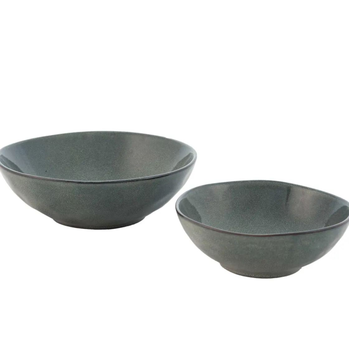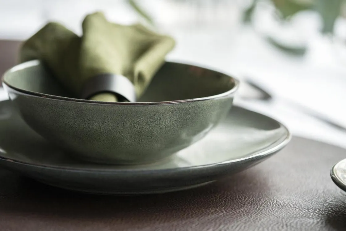 Håndlaget grønn skål fra med et moderne og stilrent design. Steintøyet er nydelig både til hverdag og fest, og det tåler å bli brukt da det har reaktiv glasur. Vi elsker den unikheten det gir når den er håndlaget – ingen produkter er like, og gir en fantastisk stemning.