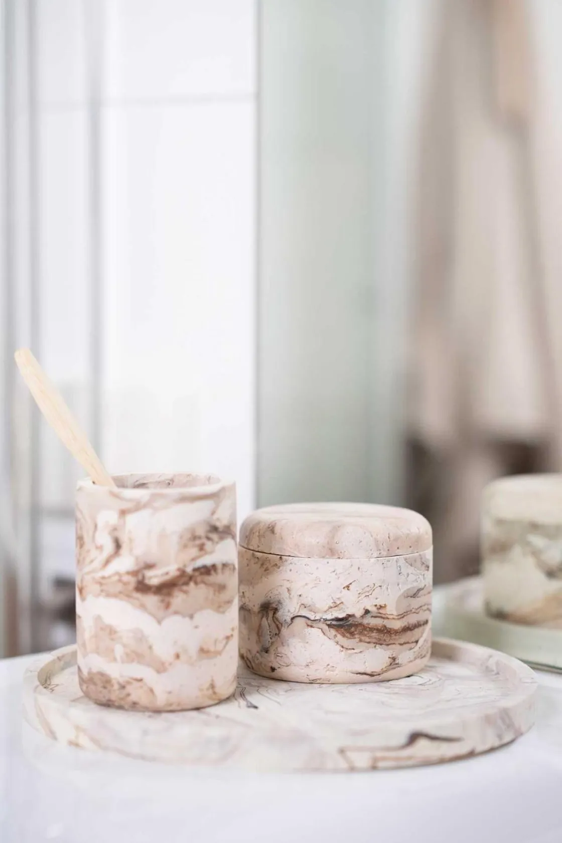 Oppdag vårt stilige tannglass i falsk marmor i beige, perfekt for å berike din daglige morgen- og kveldsrutine på badet. Marmoren gir glasset et elegant utseende, samtidig som det er praktisk og lettstelt.
