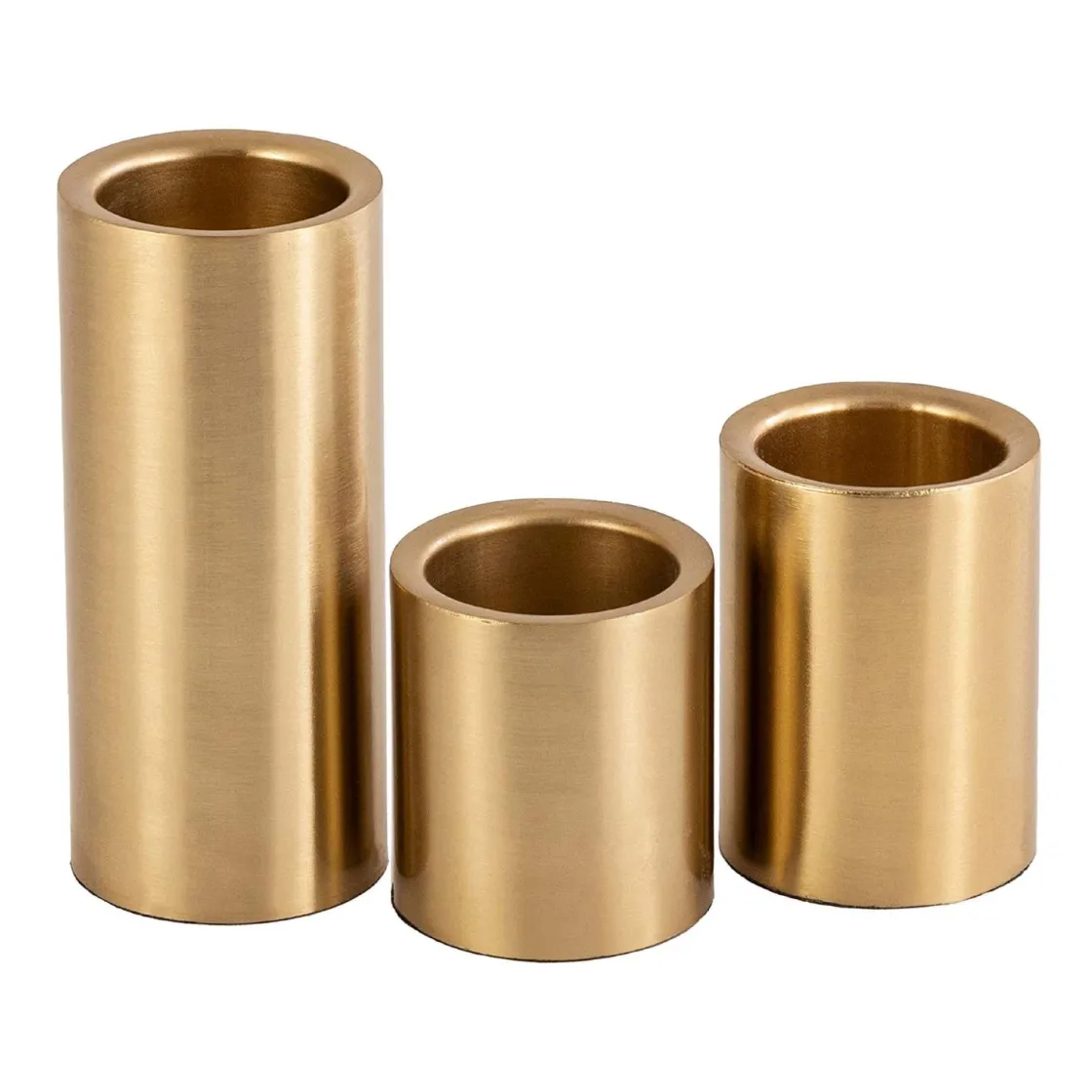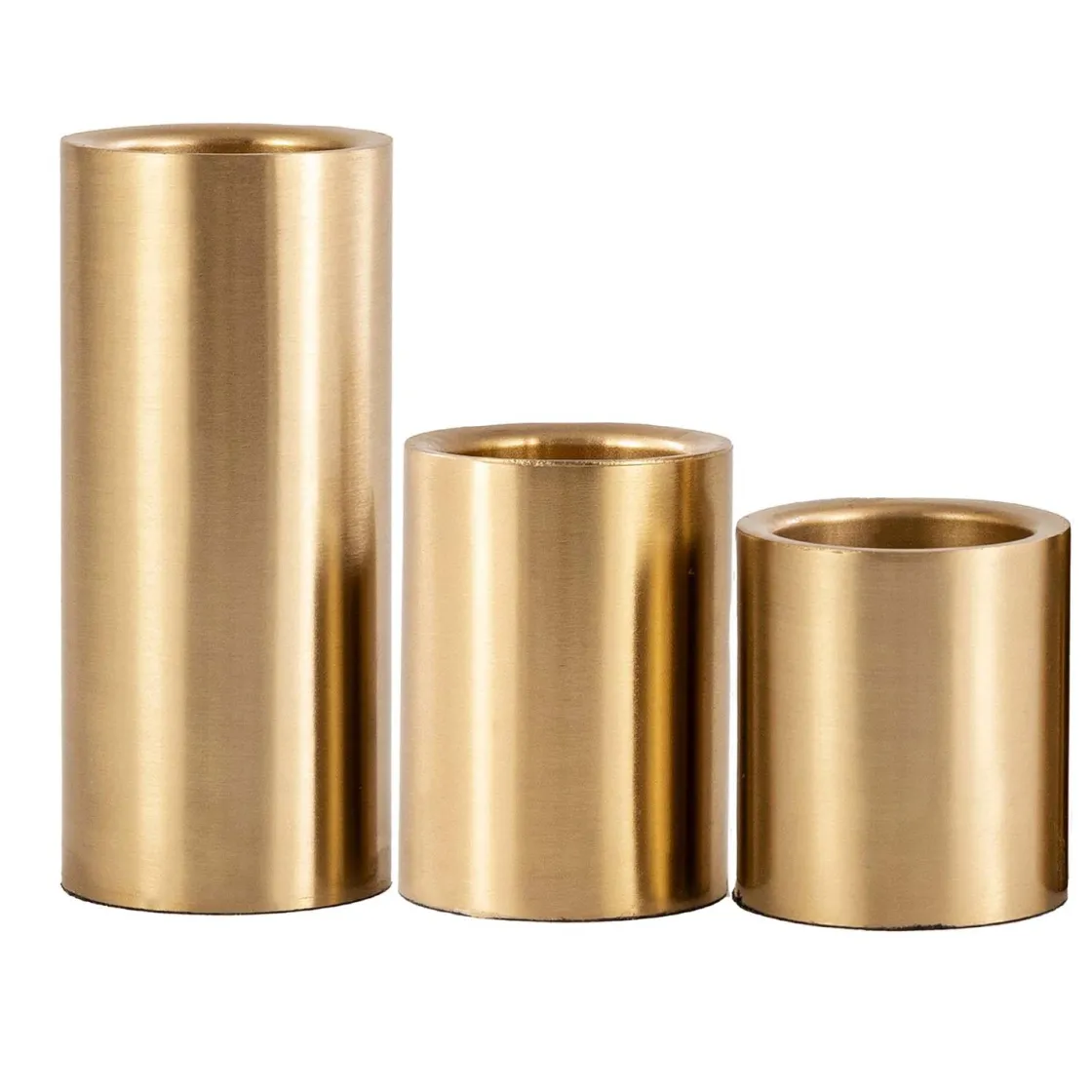 Legg til et snev av glam i hjemmet ditt med dette settet med telysholdere i gull i forskjellige høyder! De tre telysholderne lager en stilig trio når de er samlet, men kan også plasseres rundt i rommet for å skape et sammenhengende tema.
