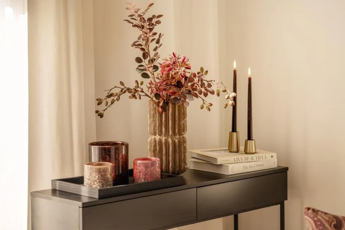 Nydelig telysholder med glatt topp og dekorative glassdetaljer i bunnen. Den dype bruntonen gir et varmt preg til små områder – på et eller et stuebord. Fin alene, men trives godt sammen med for et litt mer lekent uttrykk.