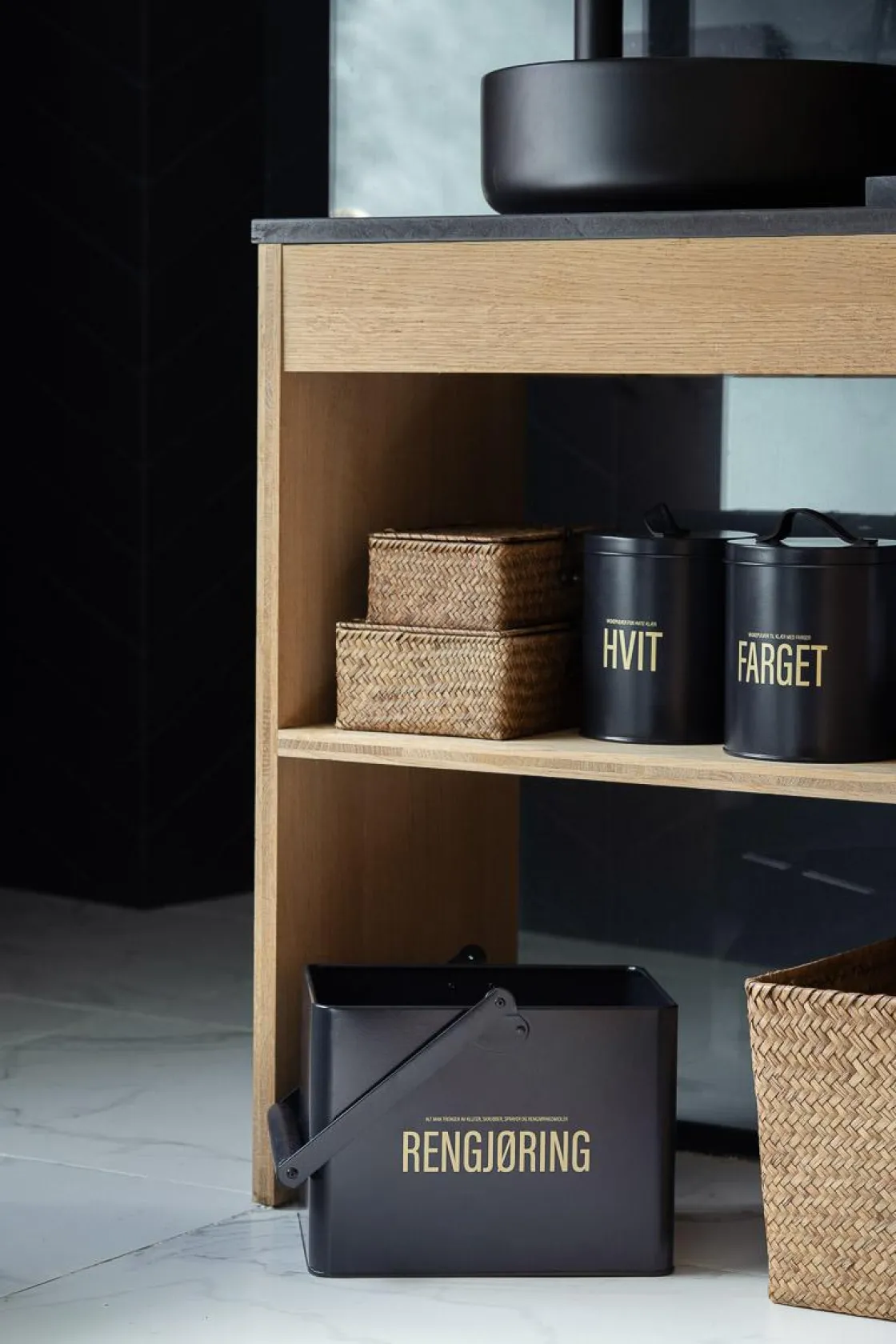 Praktisk og stilig vaskepulverboks til farget tøy. Håndtaket på lokket av skinn gir boksen det lille ekstra. Hold vaskerommet ryddig med oppbevaringsbokser.